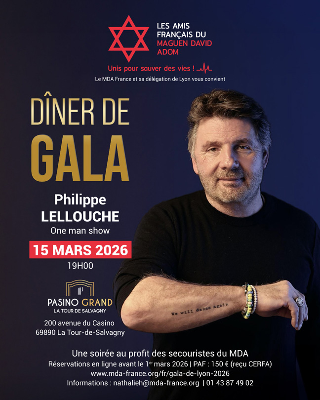 La délégation des Amis du Maguen David Adom de Lyon est très heureuse de vous convier à son gala annuel, placé sous le signe de la solidarité et de l’espoir.